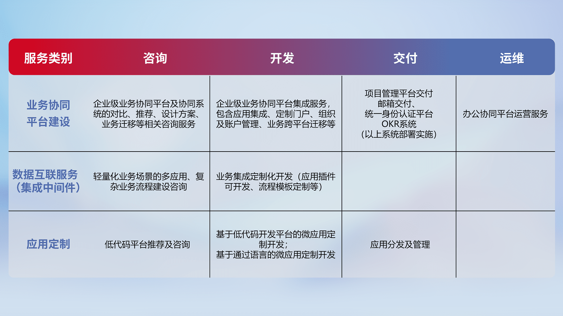 针对钉钉、、、企微、、、、IDaas等平台级产品提供产品的规划、、、方案、、交付、、、、定制化开发等服务,,,实现如统一协同办公、、、、智能客户服务、、、、混合会议管理、、智能数据查询、、、、等业务场景,,,,实现数字化转型。。。